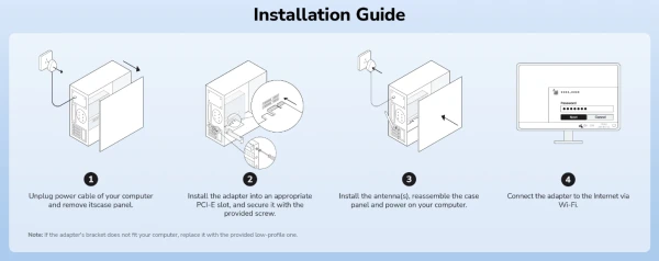 -Potrebno je da maticna ploca ima PCI-E 1x ili veci standardni slot** za napajanje i Wi-Fi funkciju.