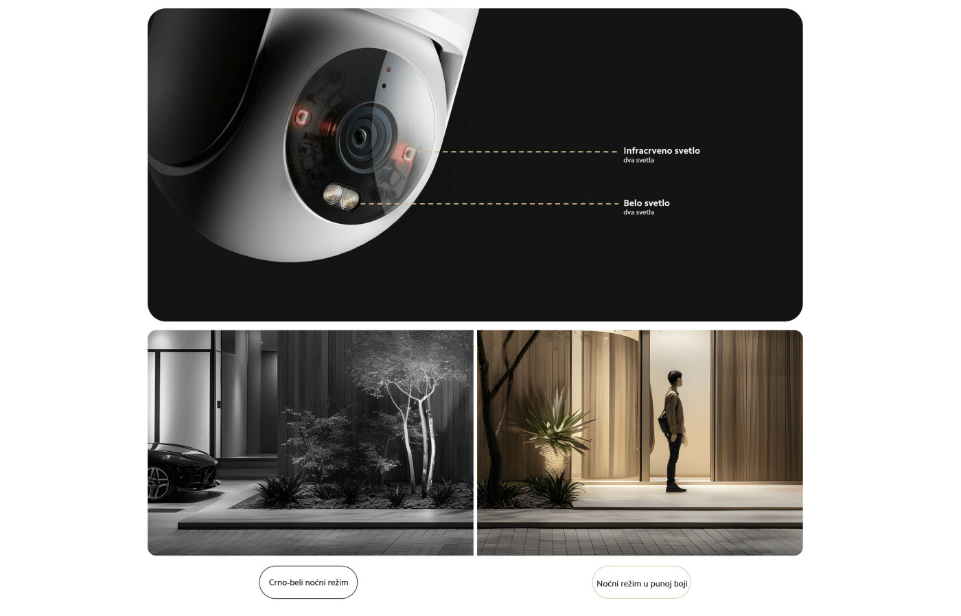 Kamera dolazi sa belim svetlom koje se automatski pali noću kada prepozna ljudsku figuru, pružajući sliku u boji u tamnom okruženju.