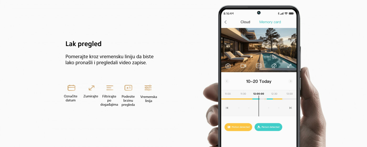 Kamera inteligentno prati kretanje ljudi. Kada otkrije kretanje, kamera automatski prati i snima video zapise osobe dok se kreće i šalje obaveštenja na vaš pametni telefon.